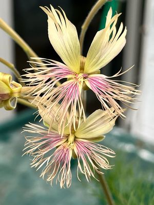 Die Blüten (oberseits von zartem gelb über weiß zu rosa wechselnd, die Unterseite violett) stehen an langen Stängeln über den weichen, gefiederten, silbergrauen Blättern.